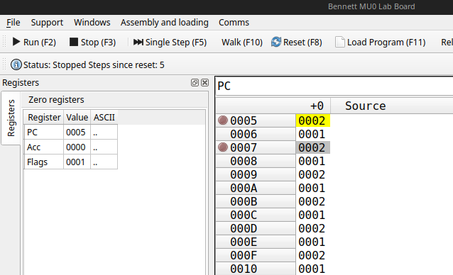 Bennett has several backend modules, for example MU0 and RISC-V. The screenshots and examples in this guide use a variety of backends, so the exact interface / register banks may differ slightly depending on which course unit you are studying. Currently Benentt is used in COMP15111, COMP12111, COMP22712, COMP32211 and COMP22111.